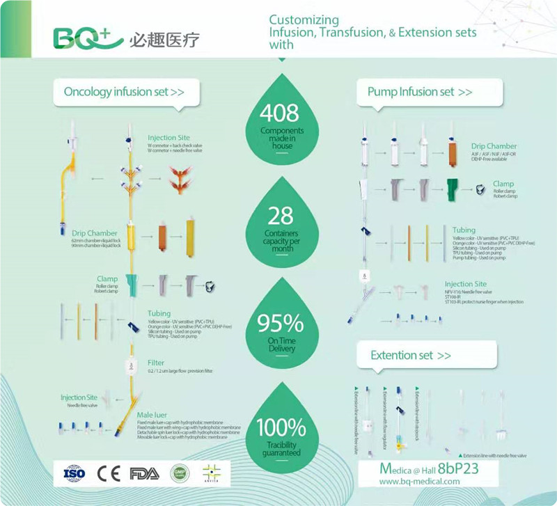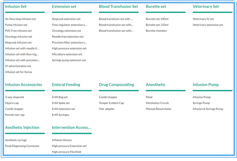 2. 組件產(chǎn)品 : 滴注腔,過濾器,尖峰,夾鉗和流量調(diào)節(jié)器,閥門,注射部位,魯爾鎖,蓋和蓋,ENFit連接器,旋塞閥