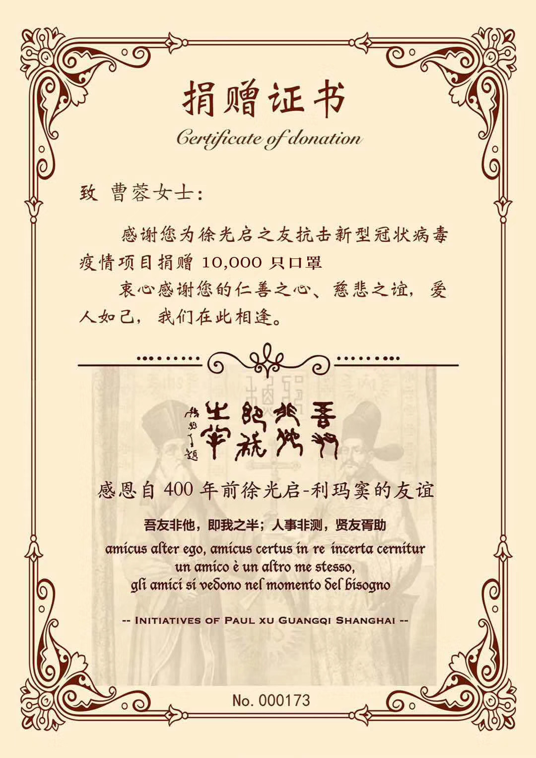 BQ Plus Medical向意大利教會捐贈了10,000個一次性防護口罩,以幫助當?shù)氐慕虝F體和醫(yī)院。出于感謝,教會向BQ頒發(fā)了捐贈證書。